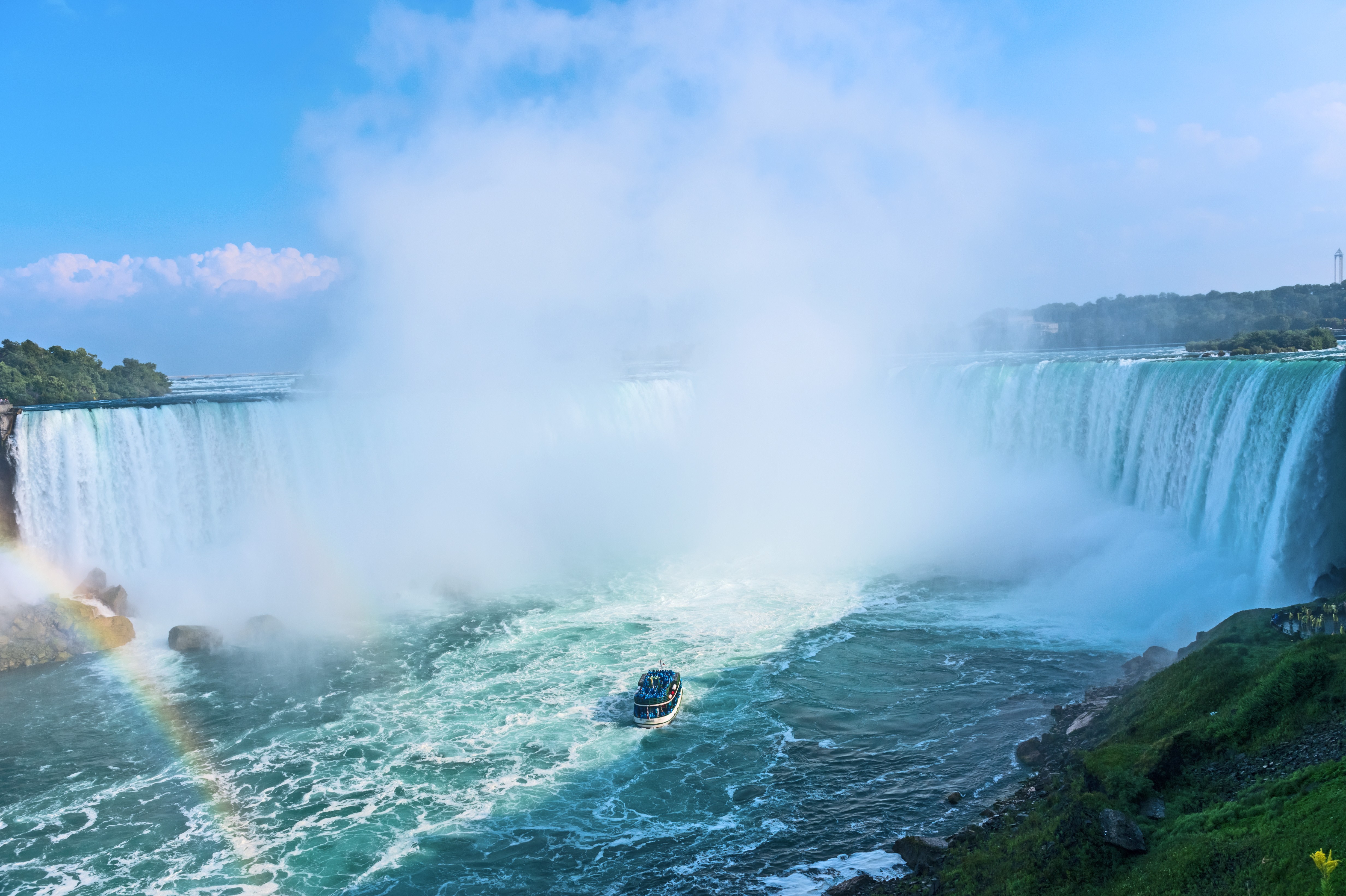 【跨境瀑布盛宴】白天近距离乘船感受尼亚加拉瀑布的磅礴气势,夜晚欣赏灯光映照下的梦幻瀑布景观,多角度尽览自然奇观。