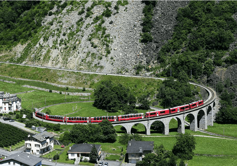 *伯連納景觀列車Bernina Express(Tirano-St.Moritz),沿著蜿蜒曲折的山路前進,穿過綠意盎然的森林、阿爾卑斯山區的萬年冰河、碧綠的山間湖泊…豐富多變的絕美景緻,令人沈醉,沿途經過的山口和終點站之間海拔高低落差達1828公尺,在普斯提亞沃谷地附近更有360度大轉彎,鬼斧神工的建築技術與景觀,令人讚嘆不已。