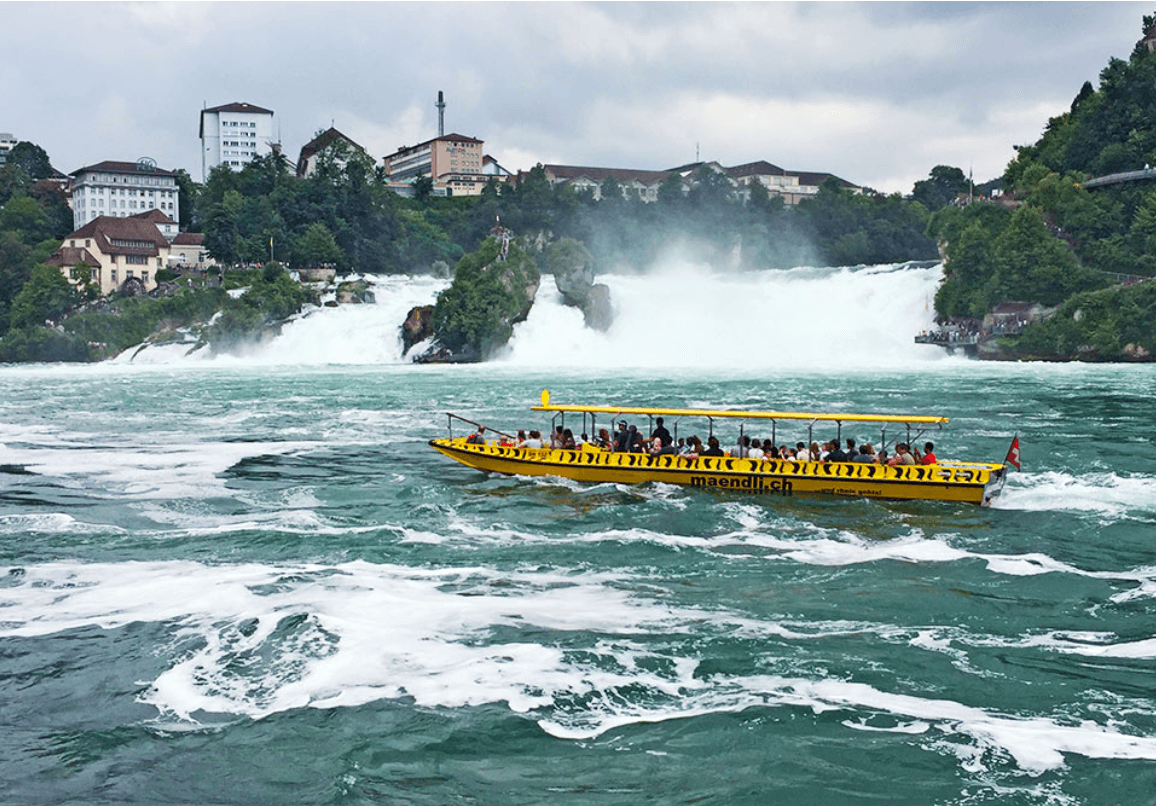 *萊茵瀑布遊船 Rheinfall Boat Tour,萊茵河即為著名的波登湖,在夏夫郝善遇上斷層形成的落差,就是萊茵瀑布,瀑布落差並不大,約20公尺左右,瀑布的美,不在它的高度,而在冰冷清澈的水從高處衝下,激起壯觀白色水花,形成碧綠色的水潭,波光粼粼、片片虹彩映照在瀑布之上,還有一座小小的島嶼在湖水中;對岸山上古堡矗立,和諧的鑲在這幅美景間,讓人如同置身畫中。在此特別安排搭乘遊船,讓您更近距離欣賞氣勢滂渤、水霧 嬝繞的壯觀景色。(※萊茵瀑布遊船如因氣候停駛,每人退費5歐元)